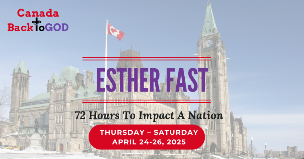 Esther Fast (in the Book of Esther) saved the lives of God’s people by impacting the King and his government leaders. Laws of the Persian Kingdom were changed, new decrees were made, and Esther and Mordecai were promoted and prospered. Jesus is the same yesterday, today, and tomorrow. Our cry, as we fast and pray for Canada, is “LORD, I have heard of your fame; I stand in awe of your deeds, LORD. Repeat them in our day, in our time make them known; in wrath remember mercy” (Habakkuk 3:2). LORD Jesus save Canada!